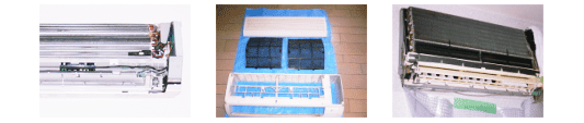 | 本体カバー、フィルターを取り外し洗浄致します。そして冷却フィンを高圧洗浄機で専用薬剤にて洗浄します。たっぷりとリンスし臭いも汚れもすべて洗い流します。 |